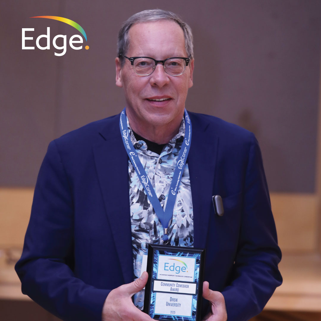 The Community Comeback Award was presented to Drew University in recognition of its significant contributions and progress within the Edge network. Drew University reaffirmed its commitment to collaboration and excellence by rejoining the network, highlighting the value of community and the strength of a shared vision. Their return demonstrates exceptional leadership and a dedication to enhancing innovation and performance through partnership. We are pleased to welcome Drew University back to the Edge network and present this award to Chief Information Officer, Bob Clougherty, who accepted on behalf of the institution.